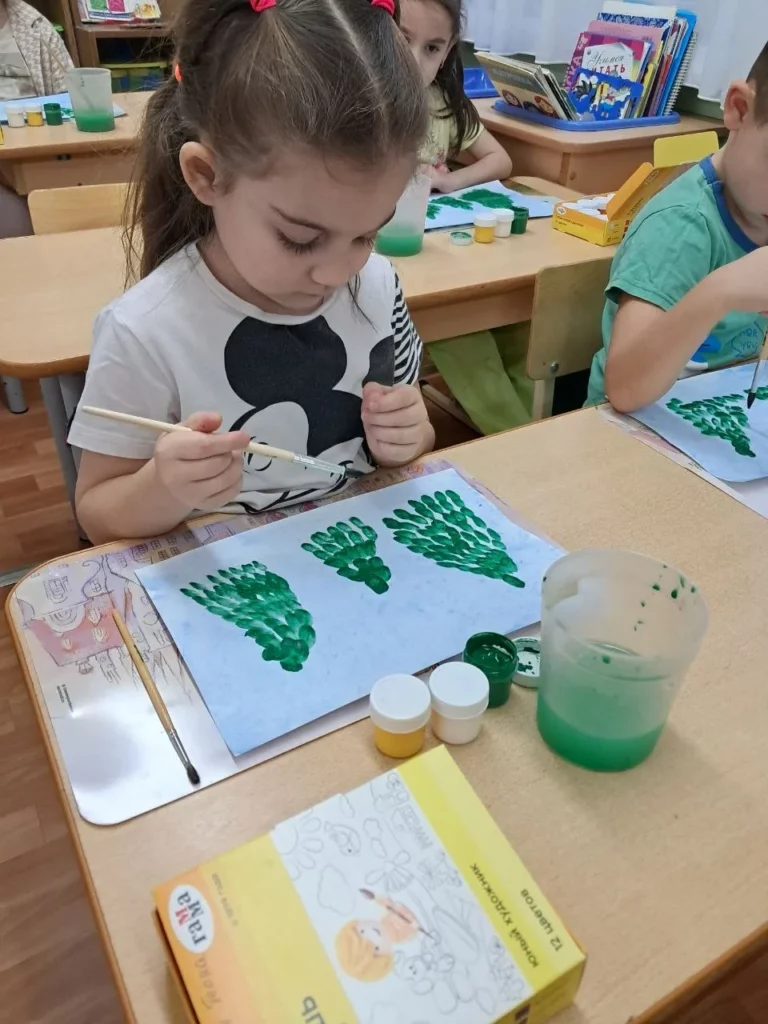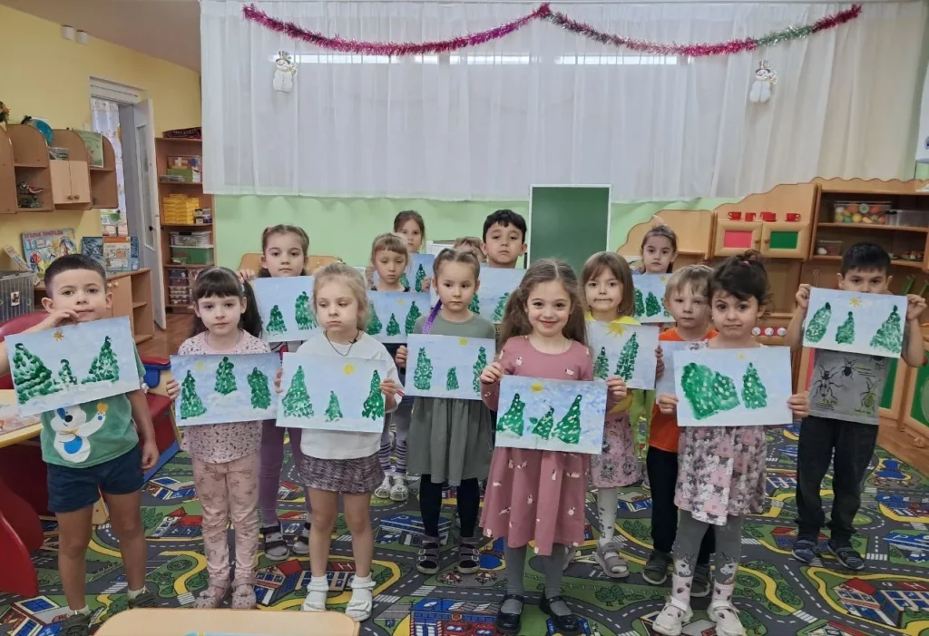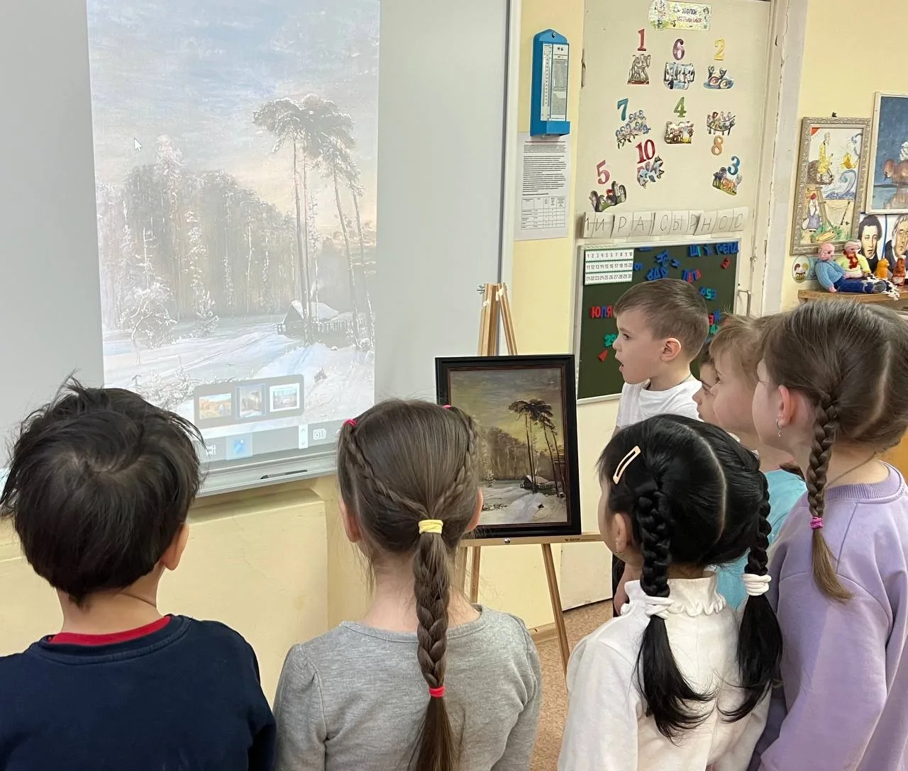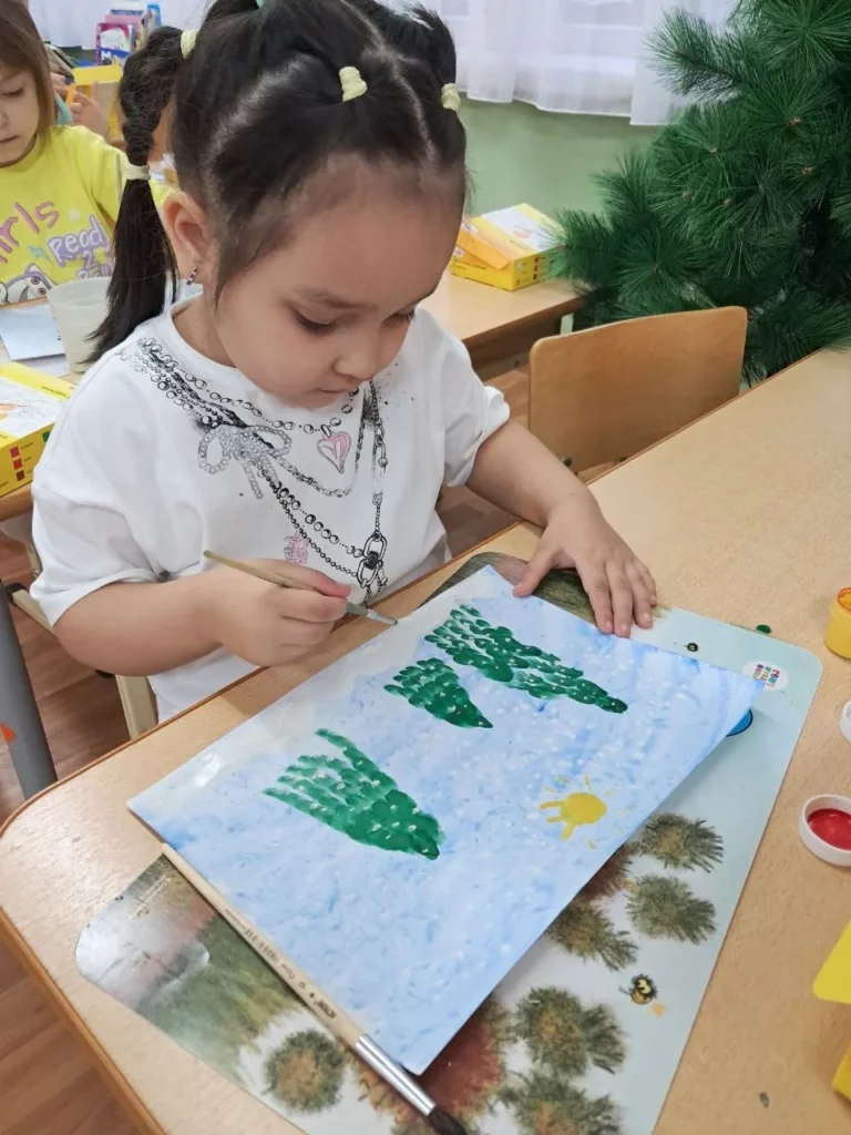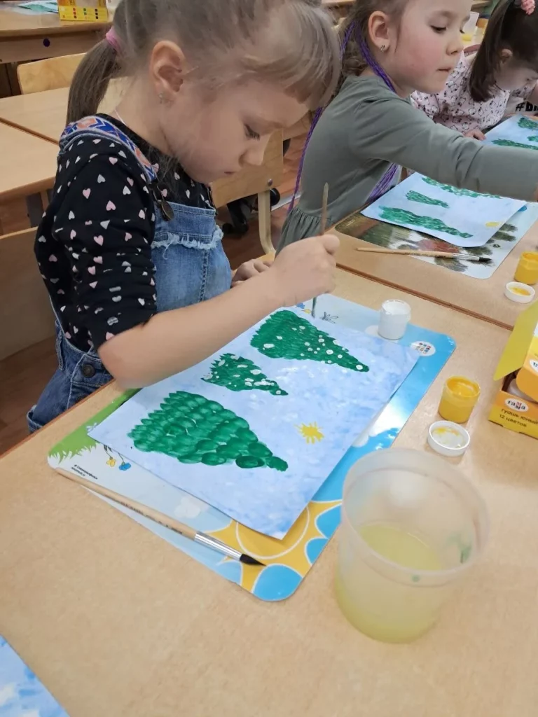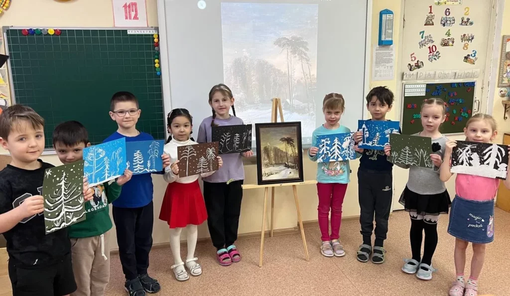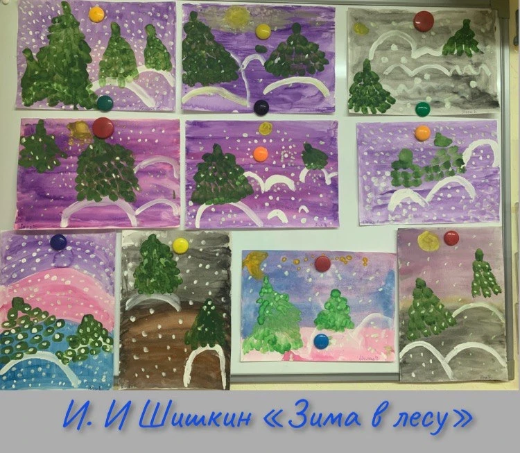 При рассматривании педагог обратил внимание детей на красоту тонких ветвей зимних деревьев, покрытых сверкающим инеем, а также на оттенки, которые использовал художник, чтобы после этого дети могли точно передать пейзаж в своих рисунках и аппликациях.