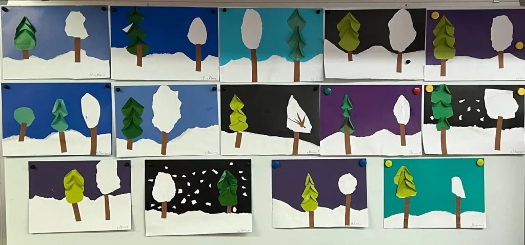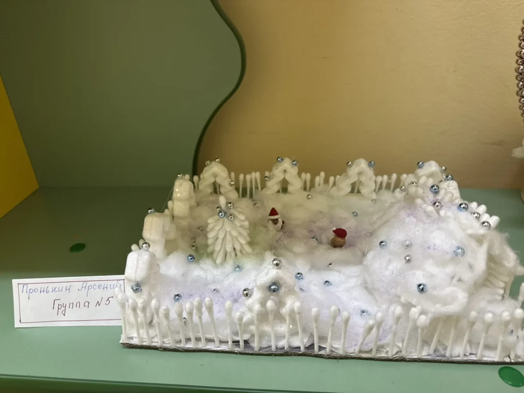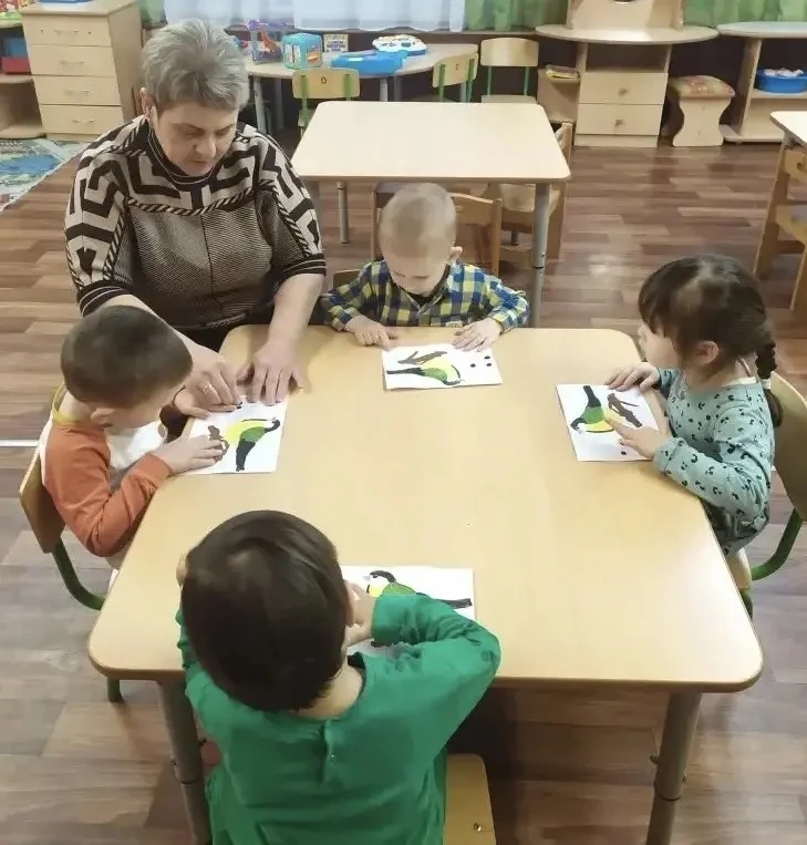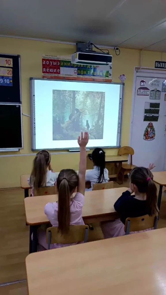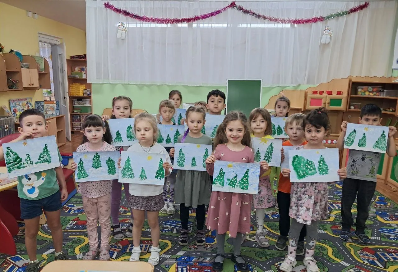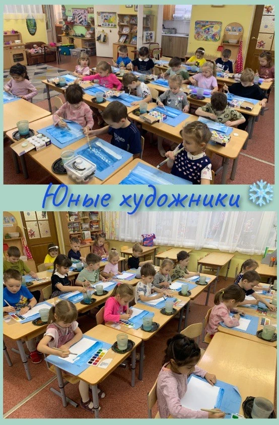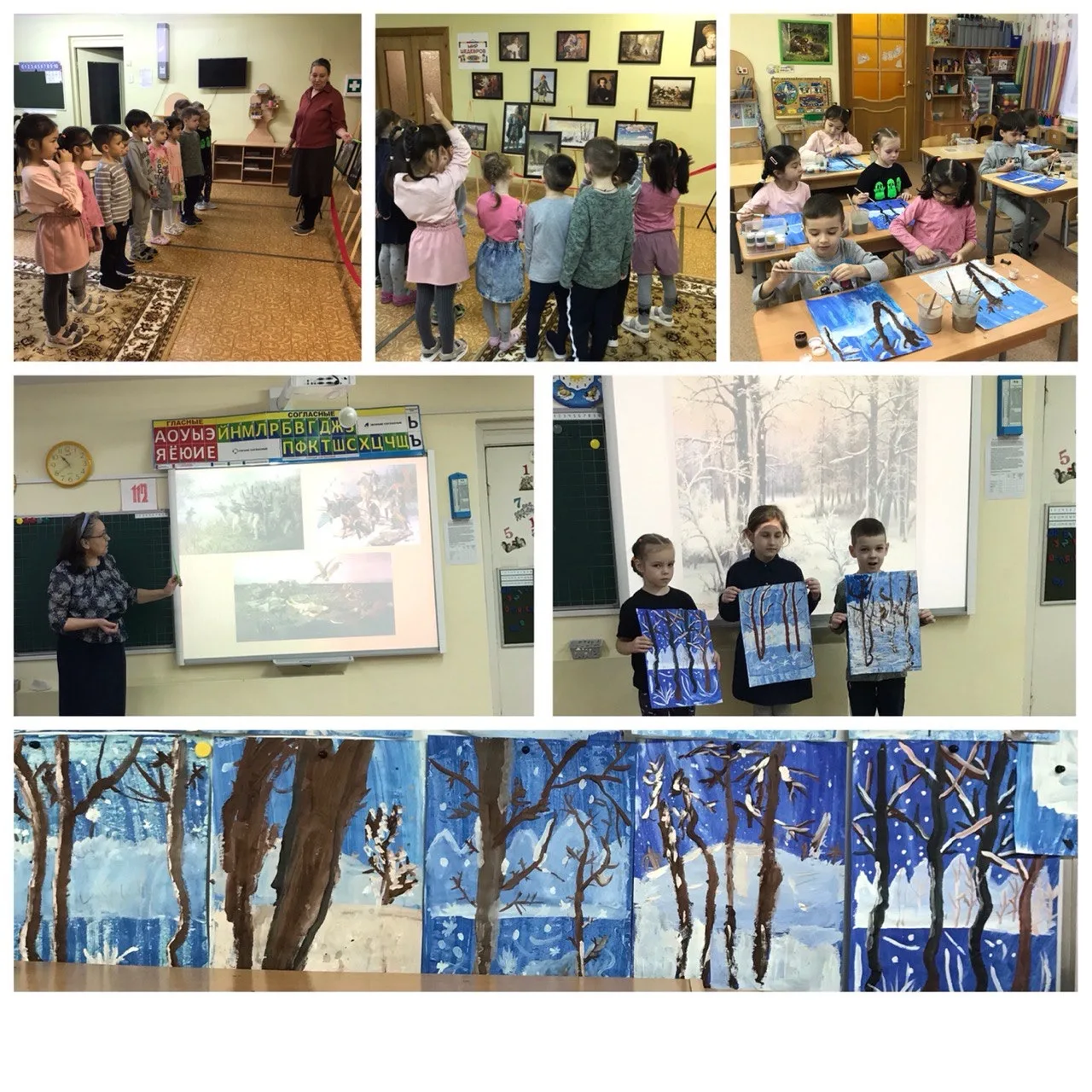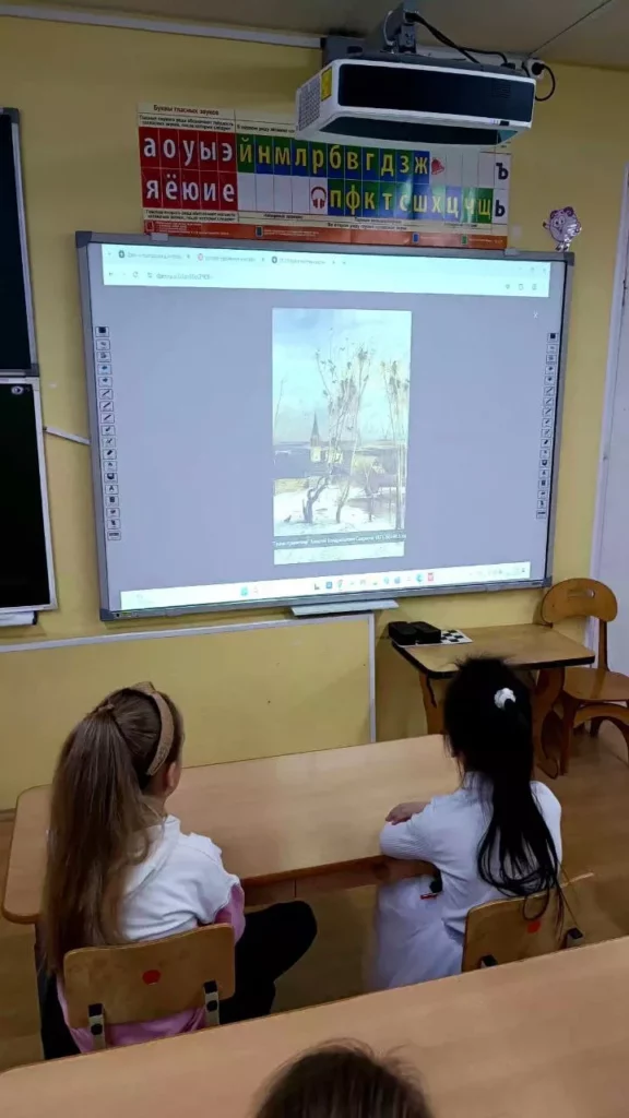 При рассматривании педагог обратил внимание детей на красоту тонких ветвей зимних деревьев, покрытых сверкающим инеем, а также на оттенки, которые использовал художник, чтобы после этого дети могли точно передать пейзаж в своих рисунках и аппликациях.