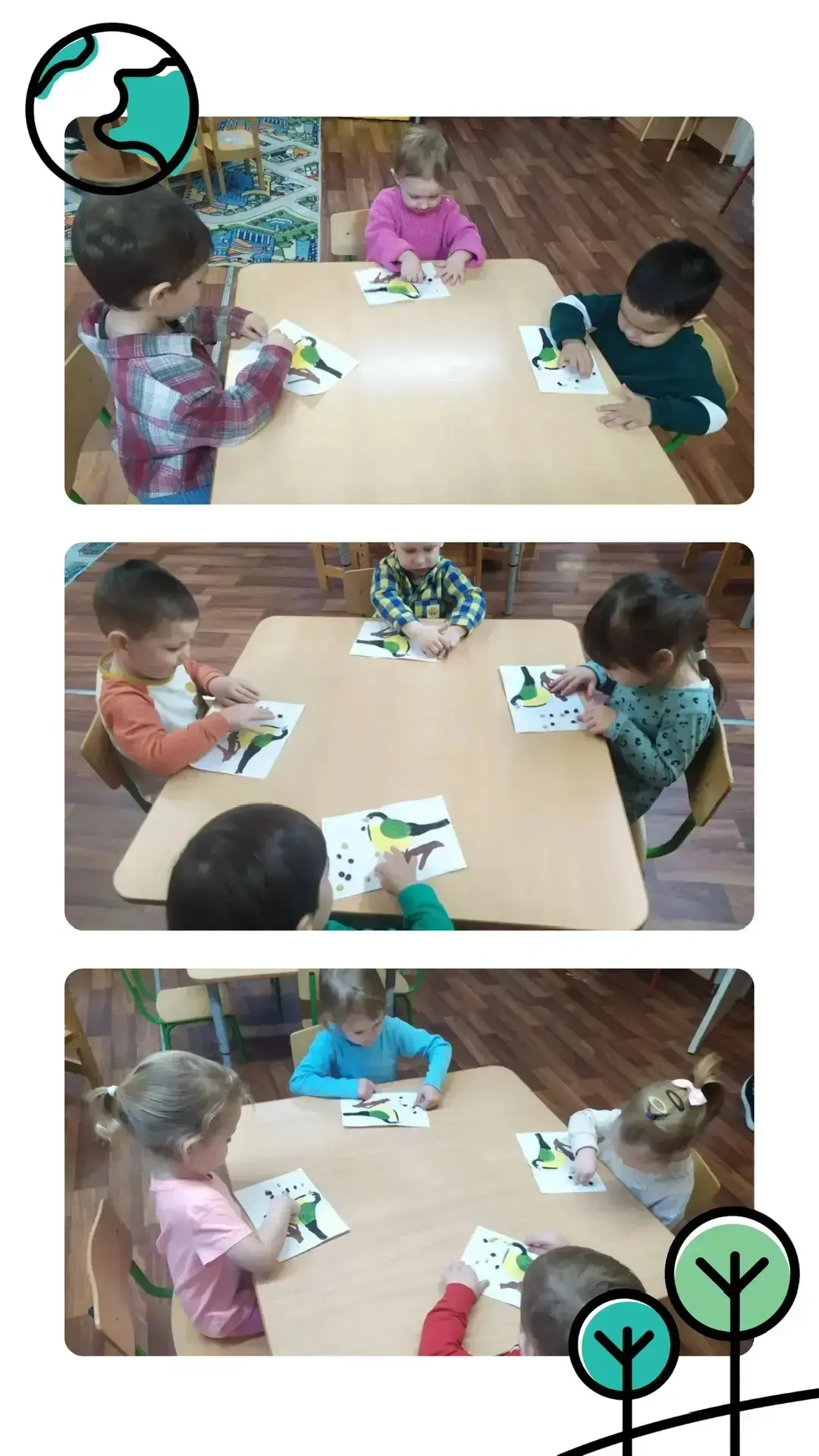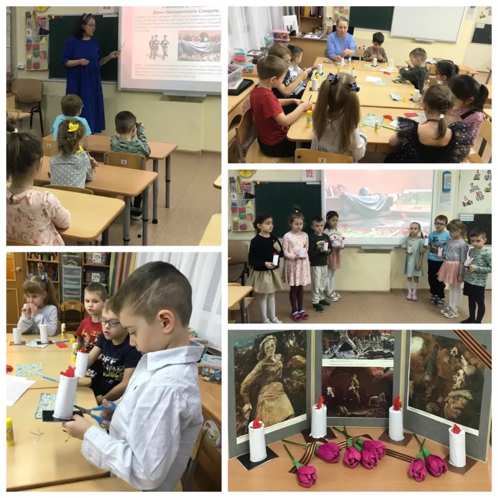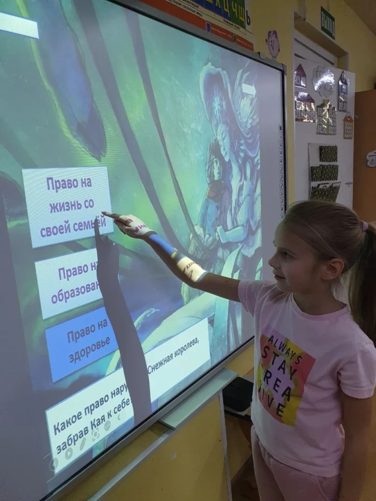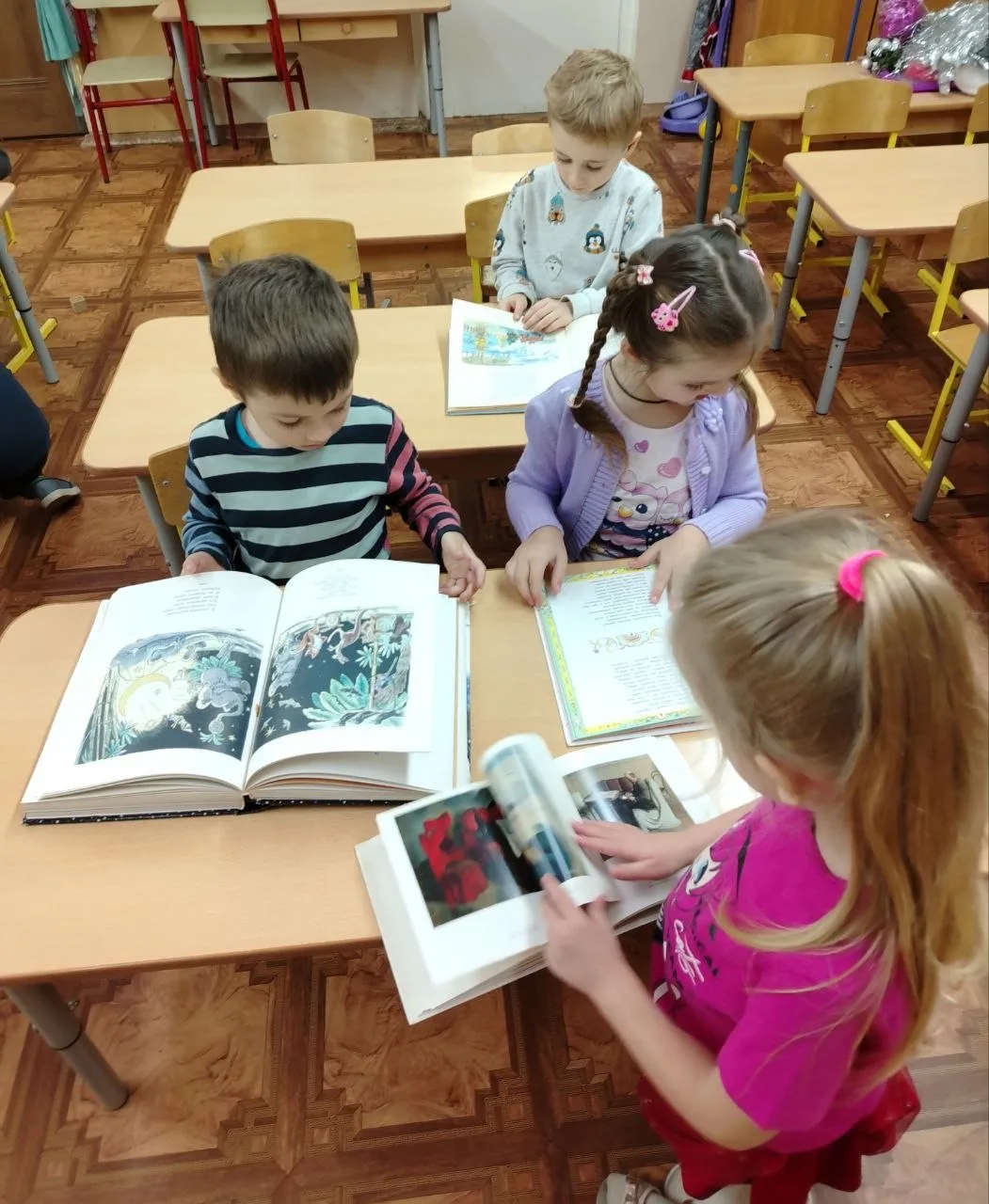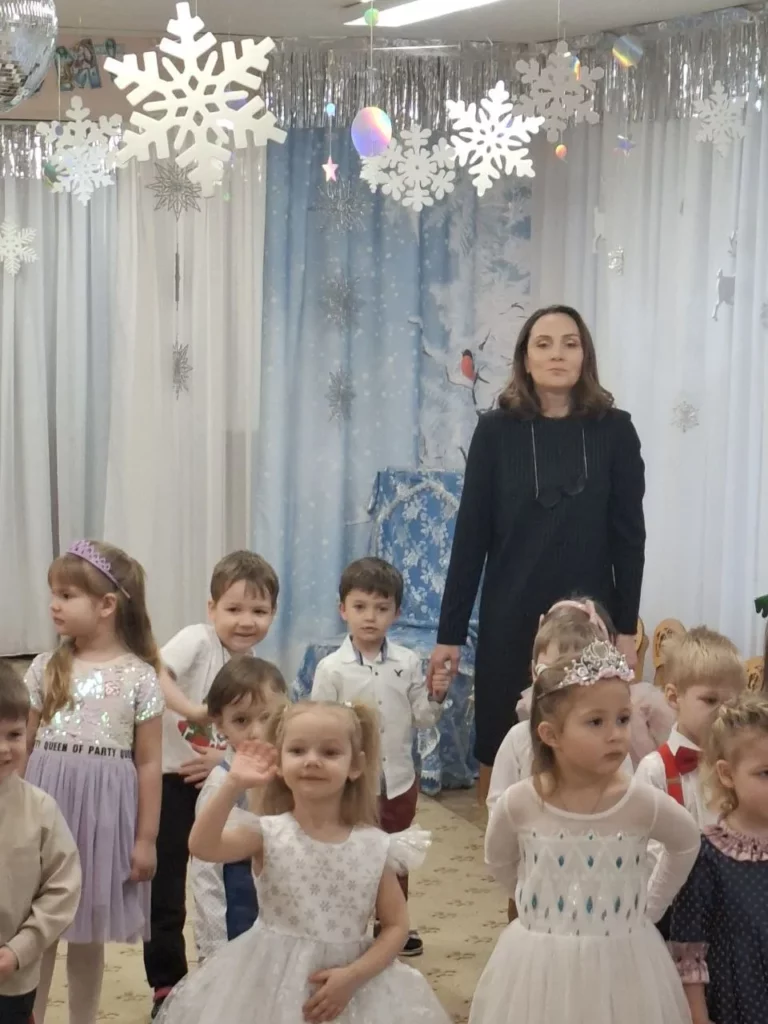 При рассматривании педагог обратил внимание детей на красоту тонких ветвей зимних деревьев, покрытых сверкающим инеем, а также на оттенки, которые использовал художник, чтобы после этого дети могли точно передать пейзаж в своих рисунках и аппликациях.